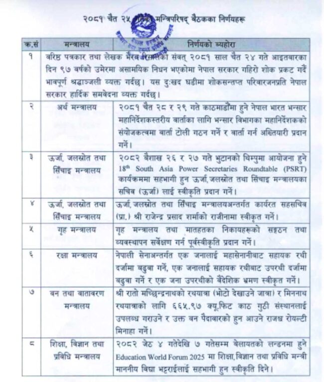 यस्ता छन् मन्त्रिपरिषद्का निर्णयहरु