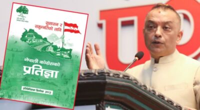 काठमाडौँ,६ फागुन । नेपाली कांग्रेसले प्रतिनिधि सभाको निर्वाचनमा जनतामाझ प्रतिज्ञापत्र सार्वजनिक गरेको छ । नेपालको ऐतिहासिक सांस्कृतिक नगरी जनकपुरधामबाट बुधबार प्रतिज्ञापत्र सार्वजनिक गरेको हो । पार्टी सभापति गगनकुमार थापा, उपसभापति एवं निर्वाचन परिचालन समितिका संयोजकथप समाचार