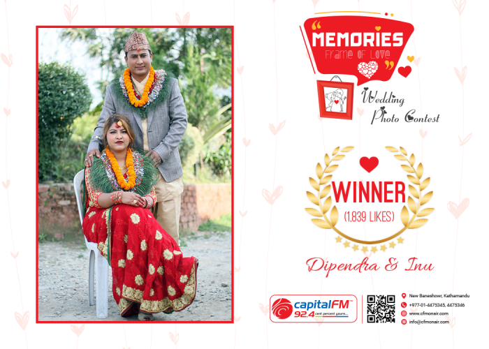 काठमाडौं, २५ पुस । क्यापिटल एफ एम ९२.४ मेगाहर्जले आयोजना गरेको Memories-“Frame of Love” फोटो प्रतियोगिताको विजेताहरुको नाम आज सार्वजनिक गरिएको छ ।