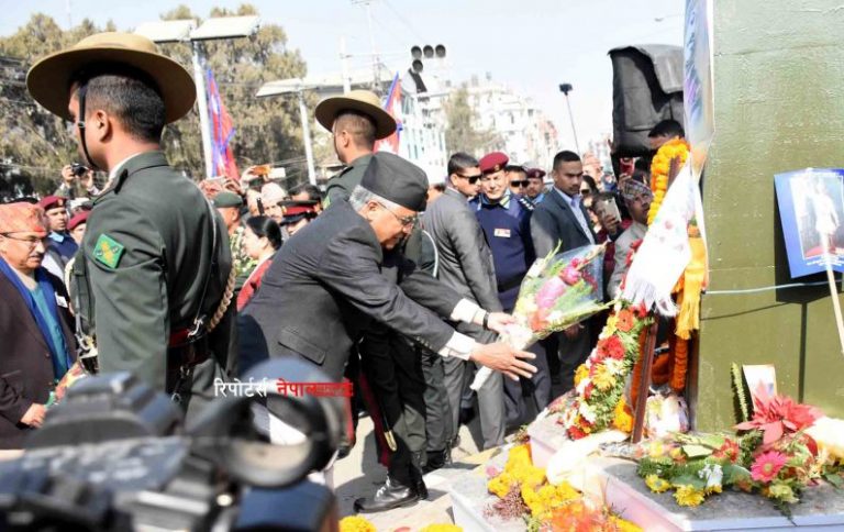 काठमाडौँ, २७ पुस रासस : राष्ट्रपति विद्यादेवी भण्डारी र प्रधानमन्त्री शेरबहादुर देउवाले राष्ट्रनिर्माता पृथ्वीनारायण शाहको शालिकमा माल्यार्पण गर्नुभएको छ । २९६औँ पृथ्वी जयन्ती तथा राष्ट्रिय एकता दिवसका अवसरमा आज सिंहदरबारको पश्चिम गेटअगाडि रहेको शाहको शालिकमा पुगेर राष्ट्रपति भण्डारी र प्रधानमन्त्री देउवाले माल्यार्पण गर्नुभएको हो ।