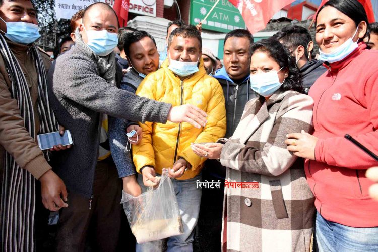 धर्नासँगै नेवि संघले महानगरपालिका उपप्रमुख हरिप्रभा खड्गीलाई काठमाडौँका विभिन्न भागबाट संकलन गरेर ल्याइएको धुलो र मास्क वितरण गरेका थिए ।