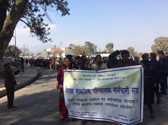 काठमाडौं, २ माघ । नेपाल सामाजिक परिचालक कर्मचारी संघले आन्दोलनको तेस्रो दिनपनि बिरोध र्याली निकालेको छ । गत पुस १४ गते राज्यमन्त्री स्तरीय निर्णयले साजिक परिचालक कर्मचारीलाई अवकास गर्ने निर्णयसँगै आन्दोलित बनेका सामाजिक परिचालक कर्मचारीहरु आफूहरुका माग पूरा नभएसम्म आन्दोलन जारी राख्ने बताउँदै आईरहेका छन् ।