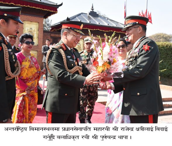 प्रधानसेनापति क्षत्रीलार्ई बलाधिकृत रथी पूर्णचन्द्र थापाले त्रिभुवन अन्तर्राष्ट्रिय विमानस्थलमा विदाइ गर्नुभएको सैनिक जनसम्पर्क निर्देशनालयले जनाएको छ ।