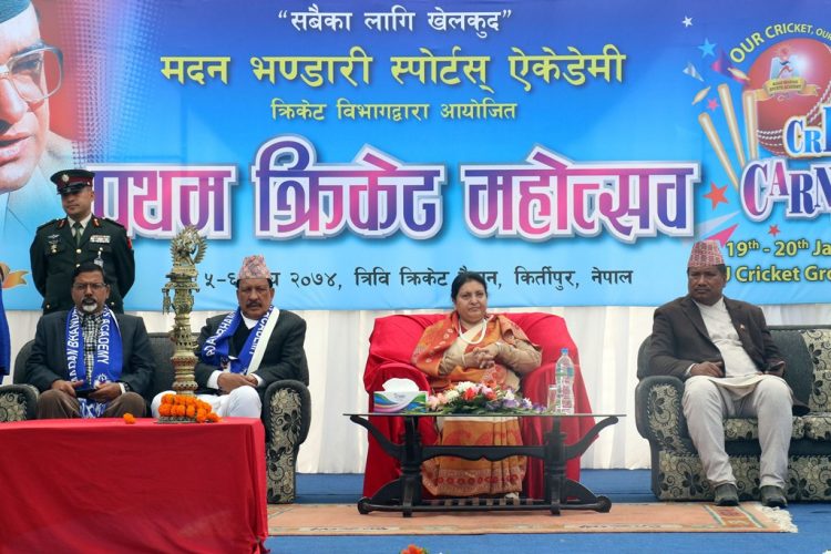 काठमाडौँ, ५ माघ : राष्ट्रपति विद्यादेवी भण्डारीले प्रथम क्रिकेट महोत्सवको आज यहाँ उद्घाटन गर्नुभयो । मदन भण्डारी स्पोर्ट एकेडेमी, क्रिकेट विभागद्वारा आयोजित उक्त महोत्सवको उहाँले नेपाली राष्ट्रिय क्रिकेट टोलीका कप्तान पारस खड्कालाई क्रिकेट ब्याट र बल प्रदान गरी शुुभारम्भ गर्नुभएको हो ।