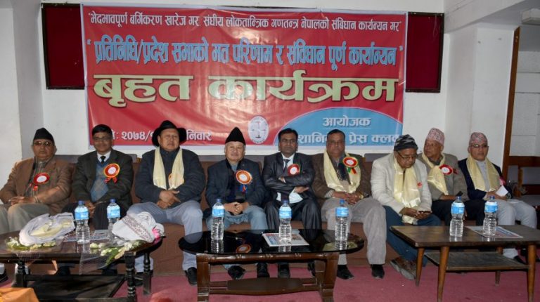 दिशानिर्देश प्रेस क्लबले आज यहाँ आयोजना गरेको ‘भेदभावपूर्ण वर्गीकरण खारेज गर, लोकतान्त्रिक गणतन्त्र नेपालको संविधान कार्यान्वयन गर’ नाराका साथ ‘प्रतिनिधिसभा तथा प्रदेशसभाको मत परिणाम र संविधानको पूर्ण कार्यान्वयन’ विषयक कार्यक्रममा प्रमुख निर्वाचन आयुक्त डा अयोधीप्रसाद यादवले संविधानको आधारमा निर्वाचन गरेर संविधान कार्यान्वयनको थालनी गरेको बताउनुभयो ।
