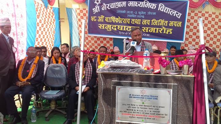 गोरखा, फुजेल–८ माघ । फुलकुमारी महतो मेमोरियल ट्रष्टको सहयोगमा निर्माण गरिएको श्री भैरवाश्रम माध्यमिक विद्यालयको नवनिर्मित भवनको आज समुद्धघाटन भएको छ ।