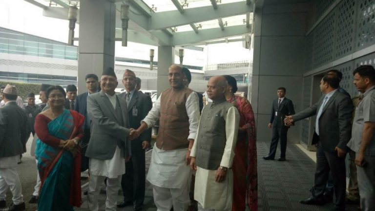 भारतीय जनता पार्टीका पूर्वअध्यक्ष समेत रहेका गृहमन्त्री सिंहले विमानस्थलमा स्वागत गरेका छन् ।  प्रधानमन्त्री ओली भारतको तीनदिने राजकीय भ्रमणमा छन् । प्रधानमन्त्री ओली शुक्रबार विहान ५४ सदस्यीय नेपाली प्रतिनिधिमण्डलको नेतृत्व गर्दै भारत प्रस्थान गरेका हुन् ।