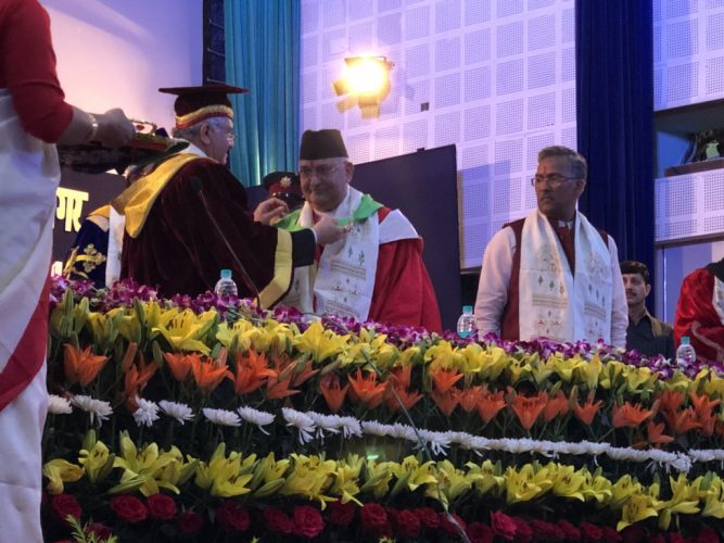 आइतबार दिउँसो प्रधानमन्त्री ओलीलाई विश्वविद्यालयमा आयोजित समारोहमा क्याम्पसका कुलपतिले ओलीलाई ‘डक्टर अफ साइन्स’को मानार्थ उपाधि प्रदान गरेको हो ।