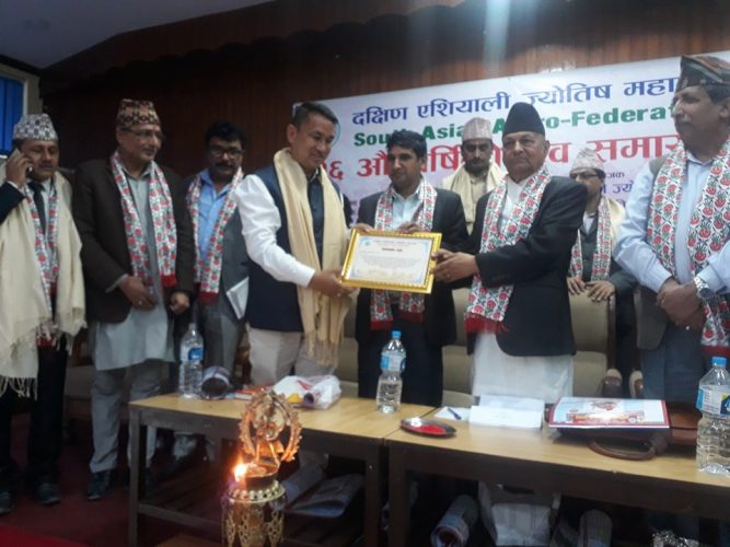 काठमाडौं, ५ बैशाख । दक्षिण एशियाली ज्योतिष महासंघले आज नेपाल पत्रकार महासंघका उपाध्यक्ष दिलिप थापा मगरलाई सम्मान गरेको छ ।