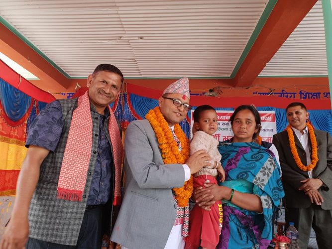 अामा रिता परियारसँगै अाएका अाकाशलाई पाठ्यपुस्तक, पाेशाक लगायतका शिक्षण सामाग्री हस्तान्तरण गर्दै उहाँले अाकाशलाई विद्यालय तहसम्मकाे शिक्षाका लागि अाफ्नाे सहयाेग रहने बताउनुभयाे।