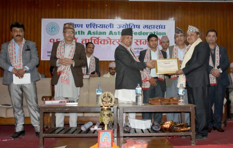 काठमाडौं, ५ बैशाख । दक्षिण एशियाली ज्योतिष महासंघले चेतना न्युज डटकमका सम्पादक रामकुमार क्षेत्रीलाई सम्मान गरेको छ । बुधबार काठमाडौंको बागबजारस्थित् हार्दिक होटेलमा महासंघले आफ्नो १६ औं वार्षिकोत्सवको अवसरमा पत्रकार क्षेत्रीलाई सम्मान गरेको हो ।