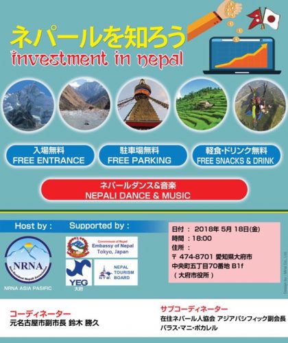 जापान, १० बैशाख । नेपालमा पर्यटन तथा औधोगिक लगानी भित्र्याउने उद्देश्यसहित जापानी लगानीकर्ताहरुलाई लक्षित गरेर नागोयामा विशेष कार्यक्रम हुने भएको छ l