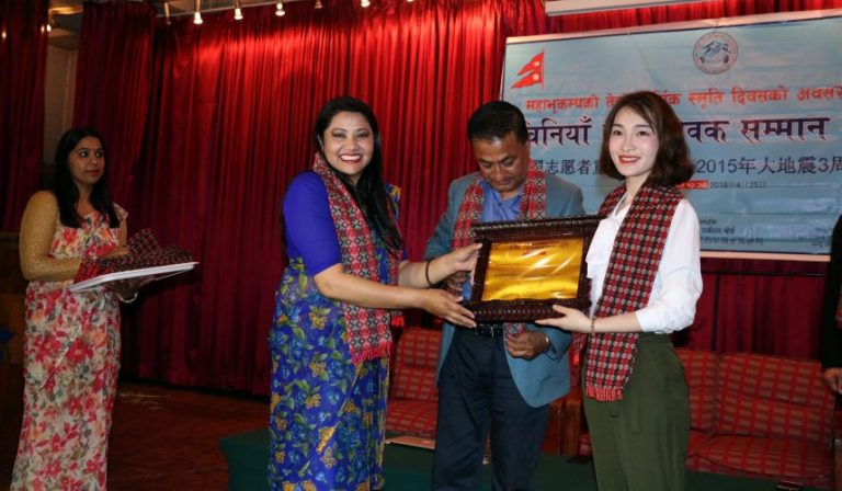 साइनो नेपाल मिडिया सोसाइटीद्वारा आज आयोजित समारोहमा सांसद एवम् नेकपा (एमाले)की नेत्री रामकुमारी झाक्रीले उहाँहरुलाई सम्मान गर्नुभयो । गोरखा केन्द्रविन्दु भएर गएको उक्त भूकम्पबाट आठ हजार ९७९ जनामा परी ज्यान गएको थियो भने २२ हजारभन्दा बढी व्यक्ति घाइते भएका थिए । भूकम्पबाट सम्पदा, सार्वजनिक भवन तथा निजी आवासमा क्षति पुगेको थियो ।