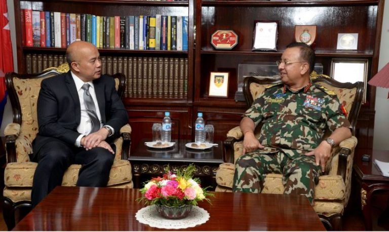 काठमाडौं, १४ बैशाख । प्रधानसेनापति राजेन्द्र क्षत्रीसँग काठमाण्डौस्थित मित्रराष्ट्र थाईल्याण्डका राजदुत Bhakvat Tanskul ले जङ्गी अड्डामा शिष्टाचार भेटवार्ता गरेका छन् ।