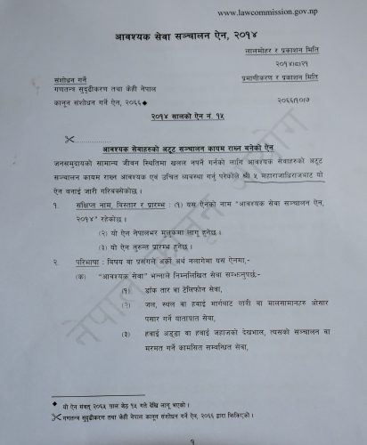 आवश्यक सेवा सञ्चालन ऐन–२०१४ अहिलेसम्म संशोधन गरिएको छैन । गणतन्त्र सुदृढिकरण तथा केही नेपाल कानून संशोधन गर्ने ऐन २०६६ बमोजिम यो ऐन संशोधन गरेर श्री ५ महाराजाधिराजबाट यो ऐन बनाई जारी बक्सेको छ भन्ने वाक्य हटाई नेपाल सरकार लेख्नुपर्दथ्यो ।