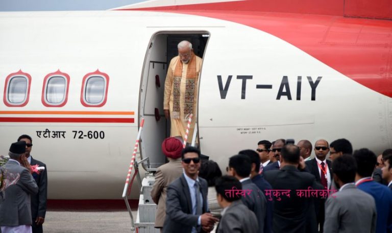 काठमाडौं, २८ बैशाख । भारतीय प्रधानमन्त्री नरेन्द्र मोदी जनकपुरबाट काठमाडौं आइपुगेका छन् । मोदी शुक्रबार बिहान साढे १० बजे एयर इन्डियाको विशेष विमानबाट जनकपुर विमानस्थलमा अवतरण गरेका थिए ।