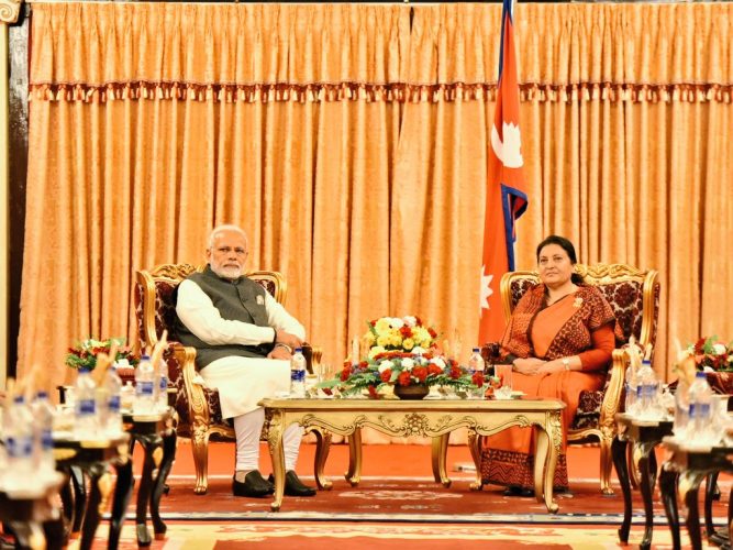 काठमाडौँ, २८ वैशाख । राष्ट्रपति विद्यादेवी भण्डारी र भारतीय प्रधानमन्त्री नरेन्द्र मोदीबीच भेटवार्ता भएको छ । राष्ट्रपतिको कार्यालय शितलनिवासमा भएको भेटवार्तामा राष्ट्रपति भण्डारी र मोदीबीच द्धिपक्षीय सम्बन्धका बारेमा कुराकानी भएको थियो।