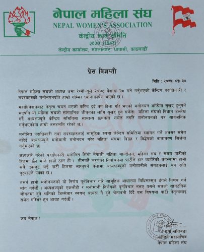 उनले अघि भनिन्,‘अध्यक्षको मनोमानी निर्णयले संगठनलाई ठूलो क्षति पुरयाउने पक्का छ, त्यसैले हामी मनोनयनको यो निर्णय पूर्नविचार गरि सामूहिक आधारमा विधिसम्म्त ढंगले निर्णय गर्न माँग गर्दछौं ।’