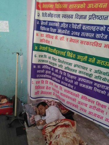 सरकारसङ्ग चिकित्सा बिधयक खारेज गरि चिकित्सा क्षेत्रमा कायम सिन्डिकेटको अन्त्य लगायतका ८ बुदे माग राख्दै वैशाख १३ गतेबाट थालिएको आमरण अनशन सम्बन्धि प्रेस बिज्ञप्ति