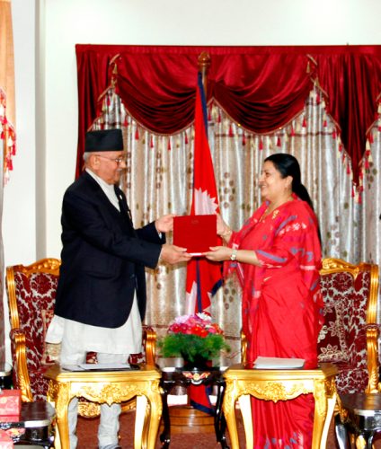 काठमाडौँ, ११ साउन / राष्ट्रपति विद्यादेवी भण्डारीसमक्ष प्रधानमन्त्री केपी शर्मा ओलीले नेपाल सरकारको आर्थिक वर्ष २०७३/०७४ को वार्षिक प्रतिवेदन आज प्रस्तुत गरेका छन् ।