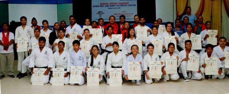 शनिबार काठमाडौंमा संघले आयोजना गरेको कार्यक्रममा अन्तराष्ट्रिय गोजू काइ कराते–डो संघको मुख्य कार्यालय हेडक्वाटर जापानबाट सोडान , निडान र सानडान प्राप्त खेलाडीहरुलाइ राष्ट्रिय खेलकुद परिषद राखेपका सदस्य सचिव केशव बिष्ठले प्रमाणपत्र बितरण गर्नुभएको हो ।