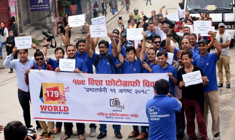 काठमाडौं, ३ भदौ । राष्ट्रिय फोटो पत्रकार समूह (एनएफपीजे)ले १७९ औँ विश्व फोटोग्राफी दिवसको अवसरमा आज राजधानीमा प्रभातफेरीको आयोजना गरेकोछ ।