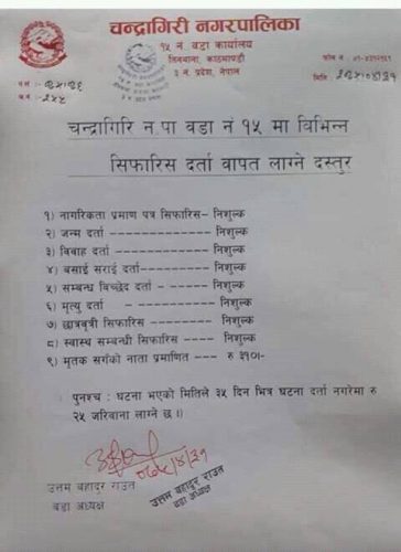 काठमाडौँ, ३ भदौ । चन्द्रागिरि नगरपालिकाले सामाजिक सेवासँग सम्बन्धित रहेका प्रमुख सिफारिशलाई निःशुल्क गरेको छ ।