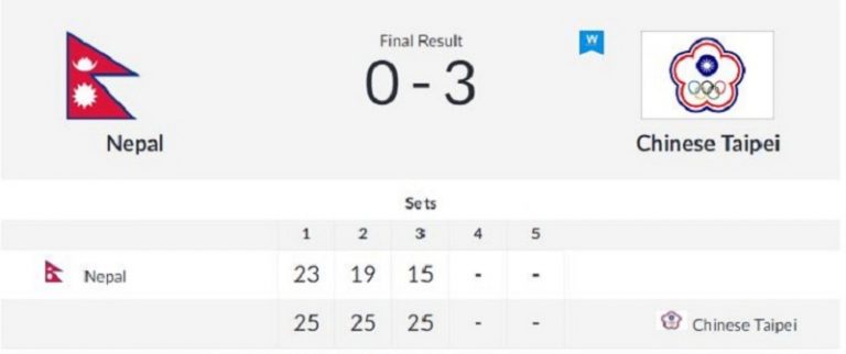 भर्खरै सम्पन्न खेलमा नेपाल २५–२३ २५–२१ र २५–१५ ले पराजित भयो । समूह ‘डी’ मा नेपालसहित दक्षिण कोरिया र चाइनिज ताइपेइ छन् । नेपालले दोस्रो खेल भदौ ८ गते दक्षिण कोरियासँग खेल्ने त्यहाँ रहेका टोली प्रशिक्षक जगदीश भट्टले जानकारी गराएका छन ।