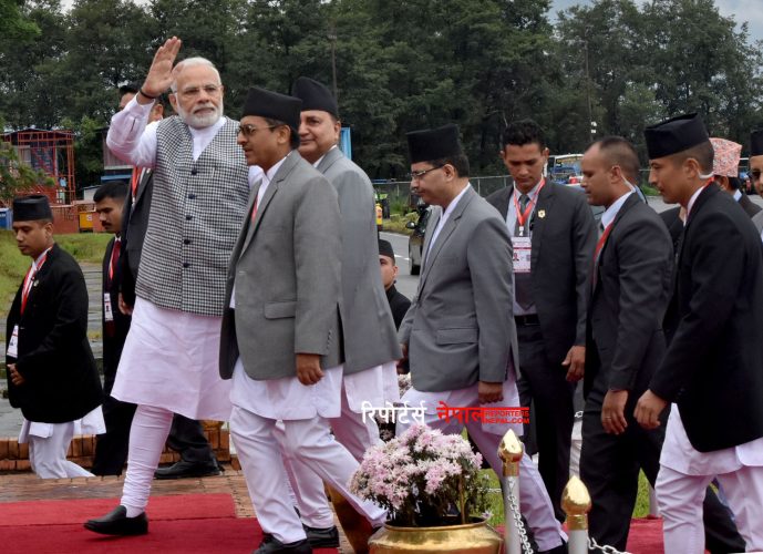 मोदीलाई त्रिभुवन अन्तर्रा्ष्ट्रिय विमानस्थलको अति विशिष्ट कक्षमा उपप्रधानमन्त्री एवं रक्षामन्त्री ईश्वर पोखरेलले स्वागत गरेका थिए ।