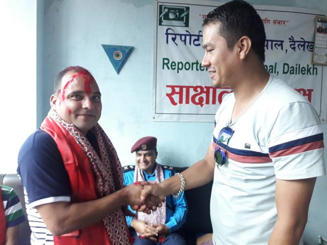 दैलेख । प्रेस चौतारी नेपाल र प्रेस सेन्टर नेपालबीच एकता पछि बनेको प्रेस संगठन नेपालमा दैलेख जिल्लाबाट प्रतिनिधित्व गर्दै केन्द्रीय समिति सदस्य हुनुभएका पत्रकार गोविन्ददेव भारती र नविन रिजाललाई आइतवार दैलेख सदरमुकाममा बधाई तथा सम्मान गरिएको छ । रिपोर्टस क्लब नेपाल दैलेखद्धारा आयोजित कार्यक्रममा केन्द्रिय सदस्यद्धय भारती र रिजाललाई बधाई तथा सम्मान गरिएको हो ।