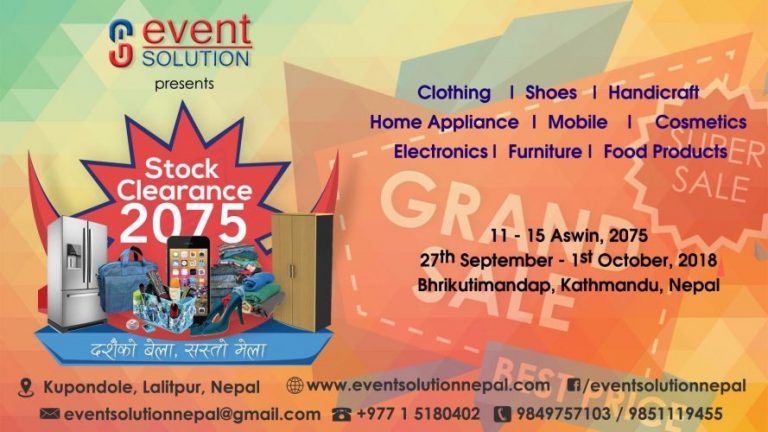 भदौ १८, काठमाण्डौ । दशैंको अवसर पारेर असोज दोस्रो साता राजधानीको भृकुटीण्डपमा स्टक क्लियरेन्स मेला आयोजना हुने भएको छ । मेलाको आयोजक इभेण्ट सोलुसन प्रालिले असोज ११ गतेदेखि नेपाल चेम्र अफ कमर्शको प्रवद्र्धनमा मेला आयोजना हुन लागेको जनाएको छ ।