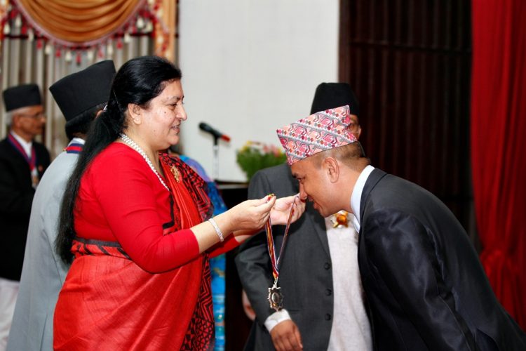 आज राष्ट्रपति कार्यालयमा आयोजित एक समारोहमा उक्त पदक वितरण गरिएको हो । २०७४ सालको गणतन्त्र दिवशको उपलक्ष्यमा घोषणा गरिएको विभिन्न १० मान पदवी मध्यबाट आज (मंगलबार) ३ सय ४५ जनालाई राष्ट्रपतिको हातबाट विभूषित गरिएको छ ।