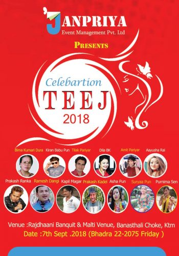 भदौ २०, काठमाण्डौ । स्वदेश तथा विदेशमा कुशल रुपमा कार्यक्रम संयोजन गरिसकेको जनप्रिय इभेन्ट म्यानेजमेन्टको आयोजनामा तिज विशेष साँस्कृतिक कार्यक्रम २०७५ हुने भएको छ ।