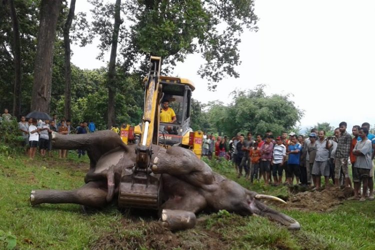 झापाको मेचीनगर–९ मागुरमाडीस्थित धानखेतमा बिहीबार बिहान मृत फेला परेको मत्ता हात्तीलाई पुर्नका लागि क्रेनको प्रयोग गरिँदै ।