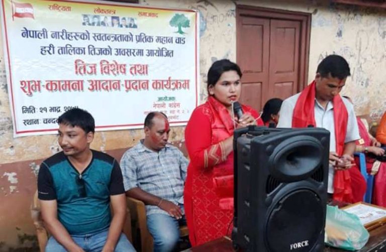 काठमाडौँ । प्रदेश नम्बर ३ कि प्रदेश सांसद कल्पना नेपालीले हरितालिका तीजको शुभकामना दिदै देश भर भईरहेको महिला उत्पीडन, बलात्कार, महिला हत्या हिँसा, चेलीबेटी बेच बिखन बिरुद्द कडा भन्दा कडा कानून निमार्ण गर्न संघीय सरकारलाई आग्रह गरेकी छन् ।