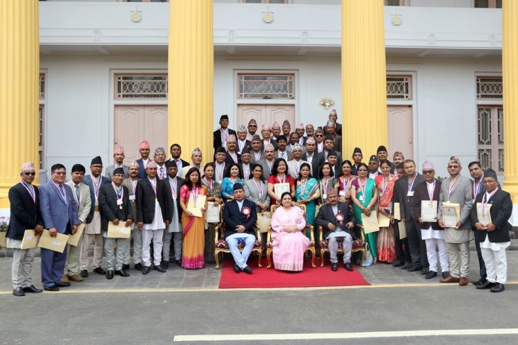 कार्यक्रममा ‘क’ श्रेणीको नेपाल विद्याभूषण पदक २३३ जनालाई, ‘ख’ श्रेणीको ११८ जनालाई र ‘ग’ श्रेणीको १७ जनालाई प्रदान गरिएको छ।