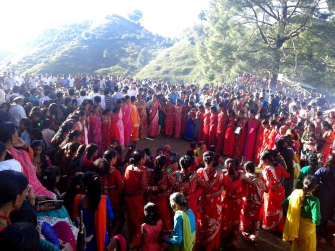 सुदूर पश्चिमेलीको मुख्य पर्व गौराको अवसरमा बैतडीको सिल्लेगडामा लागेको मेलामा देउडा खेल्दै स्थानीय महिला ।