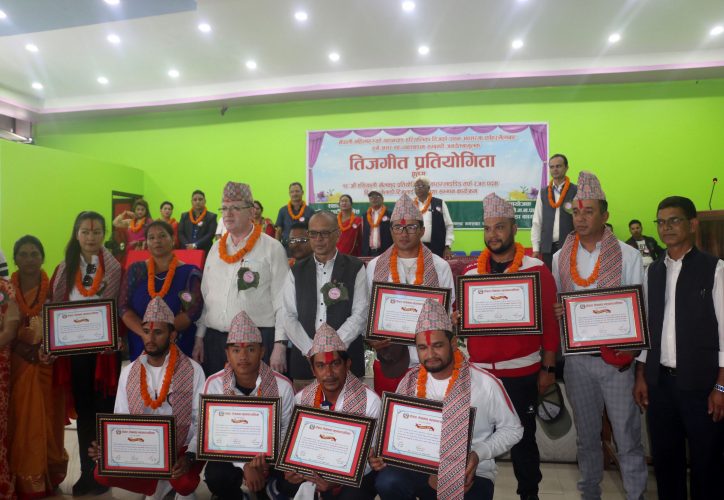 प्याराग्लाइडिङका खेलाडीलाई पोखरा महानगरपालिकामा सम्मान गरेपछि सामूहिक तस्बिर खिचाउँदै