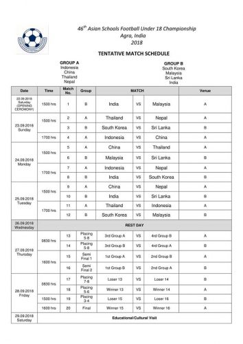 काठमाडौँ, २९ भदौ ९रासस०ः भारतको आगरामा हुने ४६औँ एशियन स्कुल फुटबल यु–१८० च्याम्पियनसीपको खेल तालिका आज सार्वजनिक भएको छ ।