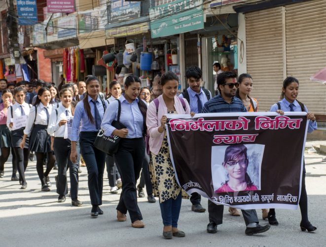 निर्मला पन्तको हत्यामा संलग्नलाई कारवाही गर्न माग गर्दै सोमबार दमौलीमा गरिएको र्यालीमा सहभागी विद्यार्थी