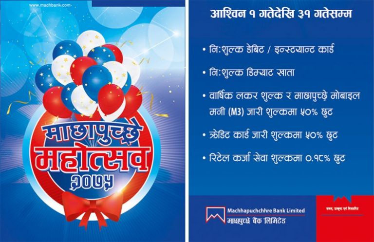 काठमाडौं, १ असोज। माछापुच्छ्रे बैंक लिमिटेडले बैंकिङ्ग कारोबार शुरु गरेको १८ वर्ष पुरा गरी १९ ‌‌‌औं बर्षमा प्रवेश गर्न लागेको उपलक्ष्यमा आश्विन महिना भरी आफ्नो सम्पूर्ण शाखाहरुमा माछापुच्छ्रे महोत्सव सञ्चालन गरिरहेको छ।