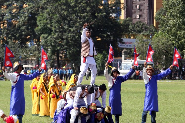 संविधान दिवसका अवसरमा टुँडिखेलमा नेपाली सेना तथा नेपाल प्रहारीले सांस्कृतिक प्रस्तुति प्रदर्शन गर्दै ।