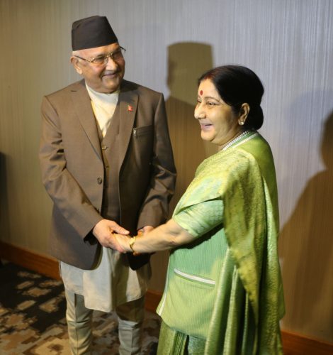 काठमाडौँ । प्रधानमन्त्री केपी शर्मा ओलीसँग भारतीय विदेशमन्त्री सुषमा स्वराजले शिष्टचार भेट भएको छ ।