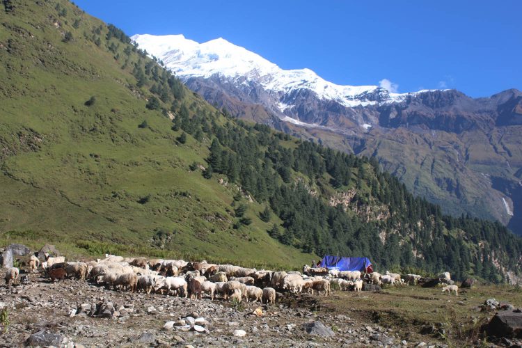 हिमाली जिल्ला मुस्ताङको थासाङ गाउँपालिका– २ छाताङमा चरी रहेका भेडाहरु र पृष्ठ भुमिमा धौलागिरि हिमाल ।