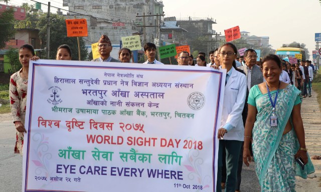 यसैबीच नेपाल नेत्रज्योति सङ्घ चितवन शाखाले आज एक कार्यक्रमको आयोजना गरी विश्व दृष्टि दिवस मनाएको छ । सो अवसरमा भरतपुर महानगरपालिकाका प्रमुख रेनु दाहाल, सङ्घका केन्द्रीय कोषाध्यक्ष चिजकुमार मास्के, पूर्वसभापति प्रभातकुमार जोशी, सभापति कृष्ण धरेल लगायतले आँखाको ज्योति गुम्नबाट बचाउन समय समयमा परीक्षण गर्नुपर्नेमा जोड दिनुभएको थियो । त्यसअघि भरतपुरको चौबीसकोठीबाट शुरु भएको प्रभातफेरी भरतपुर आँखा अस्पतालमा पुगेर कार्यक्रममा परिणत भएको थियो ।रासस