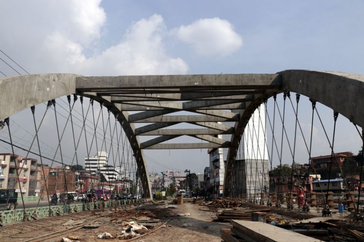 काठमाडौँको बिजुलीबजारस्थित धोबी खोलामा निर्माणाधीन आर्क ब्रीज ।
