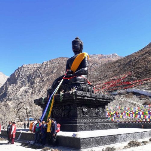 मुक्तिनाथ मन्दिर नजिकै निर्माण भएको बुद्धको शालिकसँगै तस्वीर खिचाउँदै आन्तरिक पर्यटक । तस्वीरः तारानाथ आचार्य, बलेवा (बागलुङ) रासस
