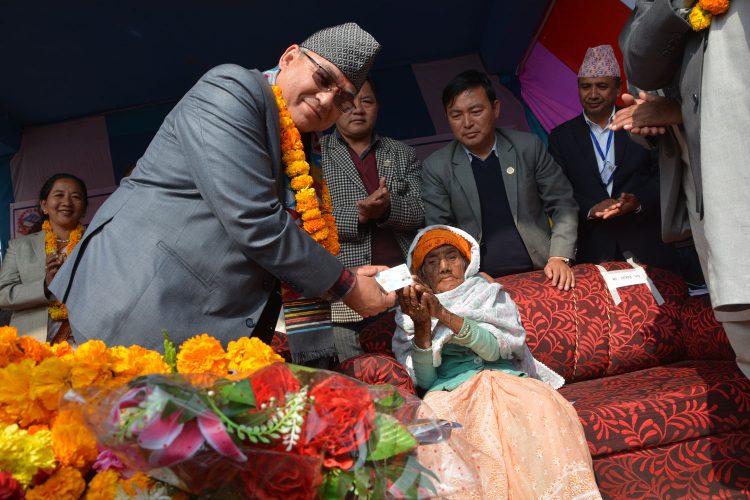 गृहमन्त्रीद्वारा ज्येष्ठ नागरिक भगवतीदेवी भण्डारीलाई राष्ट्रिय परिचयपत्र हस्तान्तरण