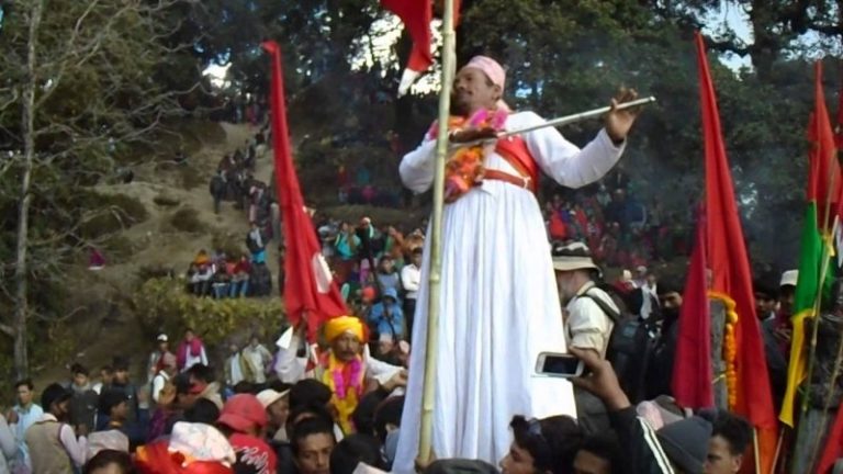 डोटी जिल्लाको बडिकेदार मेलामा मान्छेको काँधमा चढेर धामी काप्दै ।
