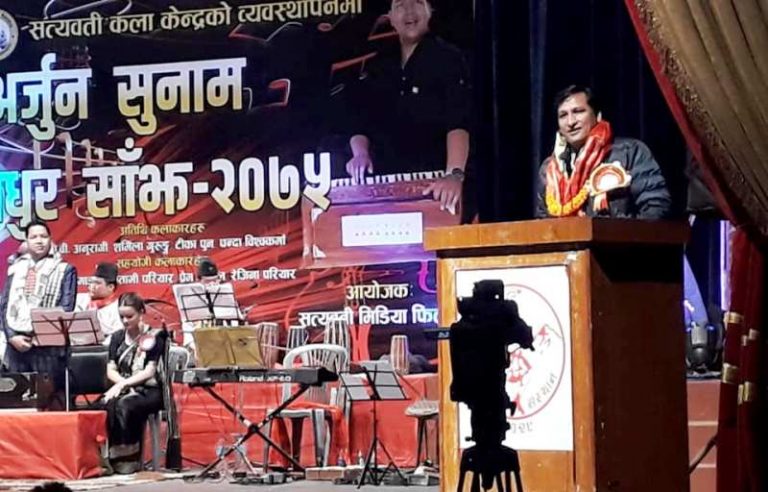 काठमाडौं । लोकप्रिय गायक ‘अर्जुन सुनाम सुमधुर साँझ २०७५’ सम्पन्न भएको छ । ‘सुर्खेतमा बुलबुले ताल’ बोलको गीत गायर चर्चामा आएका गायक अर्जुन सुनामलाई सत्यवति कलाकेन्द्रले सुमधुर साँझमा उतारेको थियो ।
